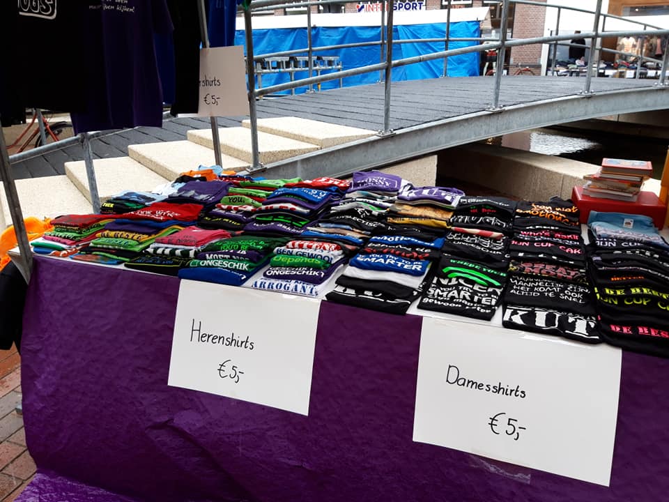 De kleding in de uitverkoop bestaat uit shirts voor dames, heren en kinderen, beschikbaar in een beperkte selectie maten. De voorraad is beperkt en geldt uitsluitend voor de maten die bij het betreffende artikel vermeld staan. Er kan niet worden afgeweken van de aangegeven maatvoering.